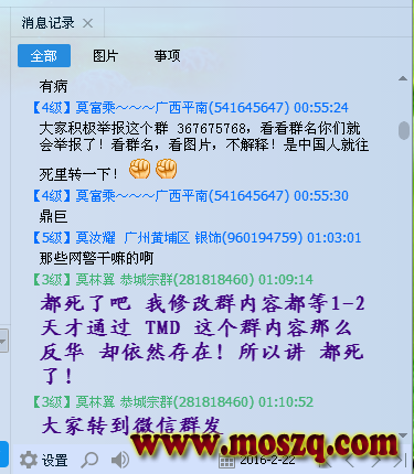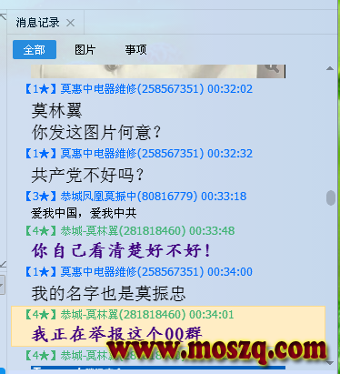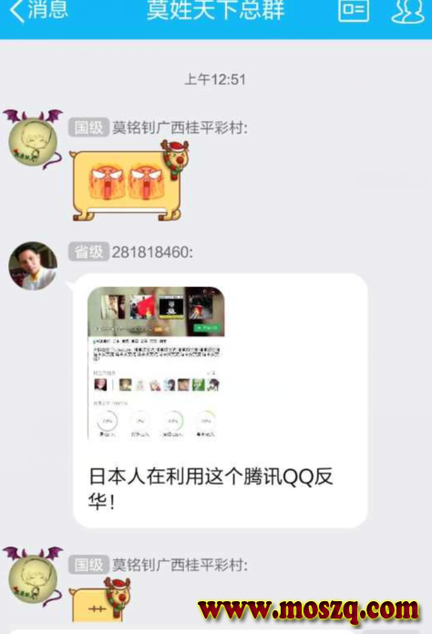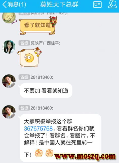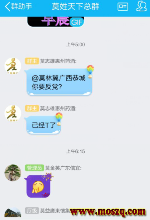本人在莫姓天下总群(1)内转发传递正能量信息居然也被他踢出宗亲群。